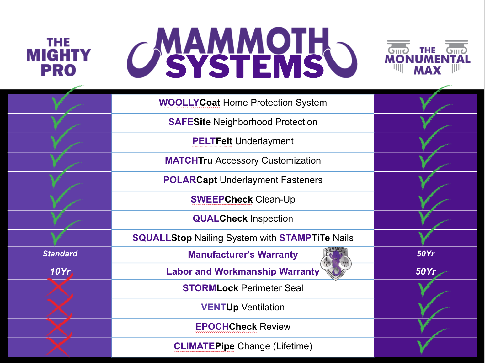 • detailed Description of mammoth's 50 year warranty for labor, material and workmanship (if available in your area)